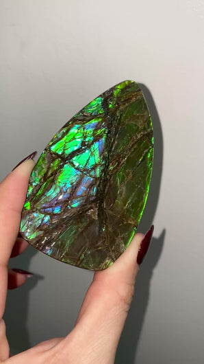 Amazing, high quality Ammolite specimen. Ammolite is a rare semi-precious gem material that comes from the fossilized shells of Ammonites, an extinct squid-like sea creatures and is estimated to around 70 million years old.