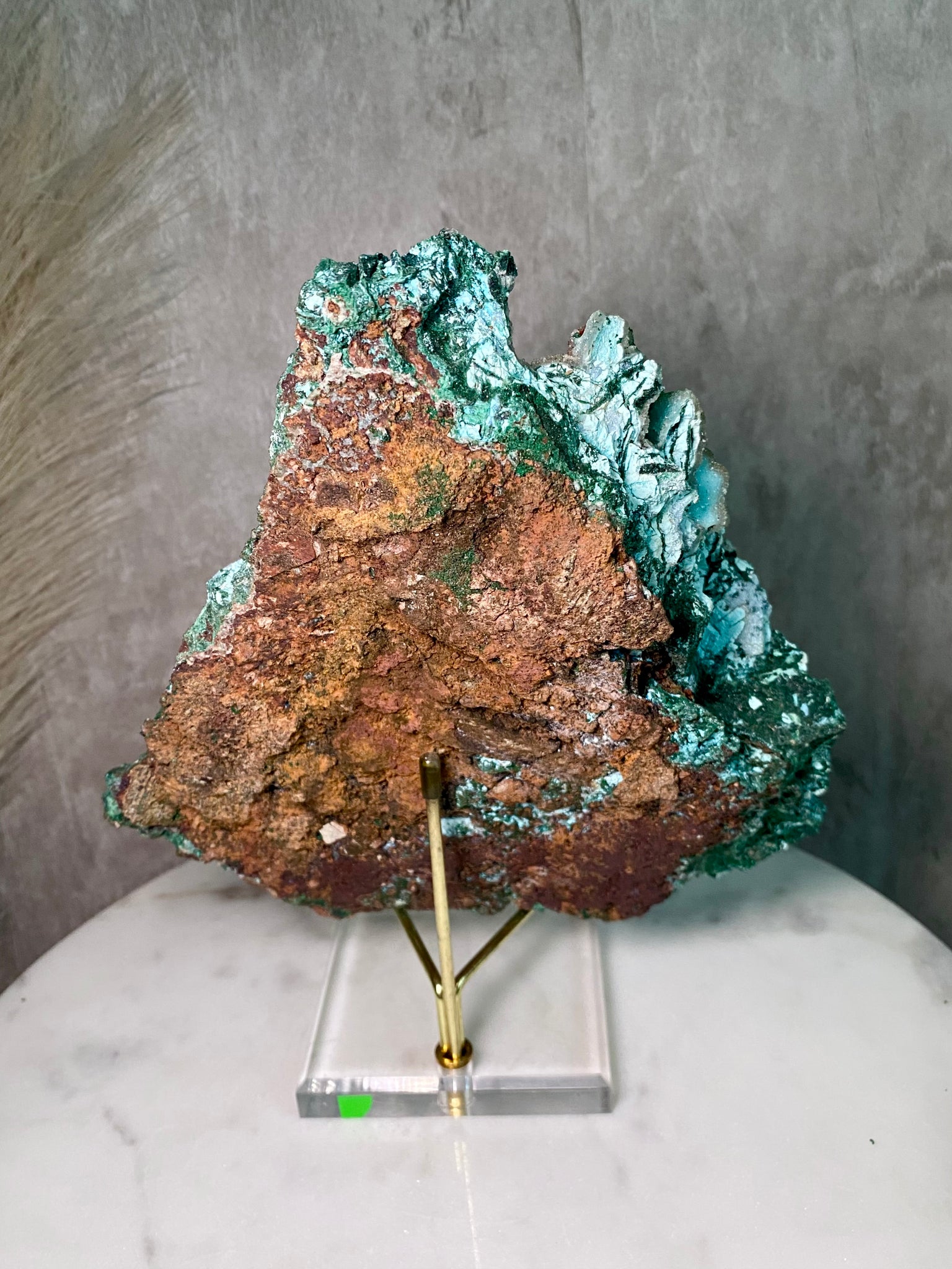 A rare combination from DRC, this pseudomorph (when one mineral completely or partially replaces another mineral) began as malachite and/or barite and azurite and was replaced by chrysocolla over millions of years. The chrysocolla has been covered with micro quartz druzy and a new generation of chatoyant malachite, giving the piece lots of contrast and all over sparkle. A very large statement piece - this size is highly unusual for the material